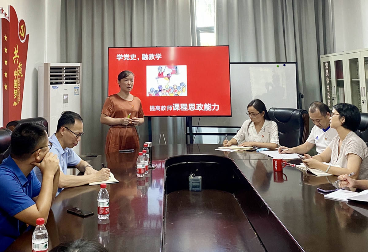 杨舰教授作了《学党史,融教学——提升教师课程思政能力》的主题分享。她结合党史学习教育及新闻案例,围绕大学精神、以史为鉴、“学高为师,身正为范”三个方面分享自身在课程设计和教学过程中的优秀做法,认为课程思政的核心在于传播正能量,教师要抓住每次授课的机会,将课程思政融入至专业知识和老员工日常学习中,做一名传播正能量的“灵魂工程师”。在备课中建议教师可根据不同的课程特色与对应的思政元素进行结合、思政教师和其他学科专业教师进行合作探讨,并以电子学科教学为例讲述了如何将思政元素融入专业教学内容并展现在课堂教学过程中。杨舰教授幽默风趣的语言、生动形象的比喻、贴近生活电影案例分享、精彩的汇报赢得老师们的阵阵掌声。