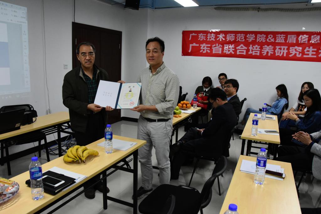 最后,崔怀林给杨总颁发了广东技术师范公司研究生校外导师的聘书,徐小平颁发了研究生联合培养基地的牌匾。通过校企合作建设研究生校外实践基地,由双方共同制定培养目标、建设相关课程、参与培养过程、建立产教学研有机融合的协同育人模式,可以提高专业学位公司产品质量,为社会输送更多的人才。