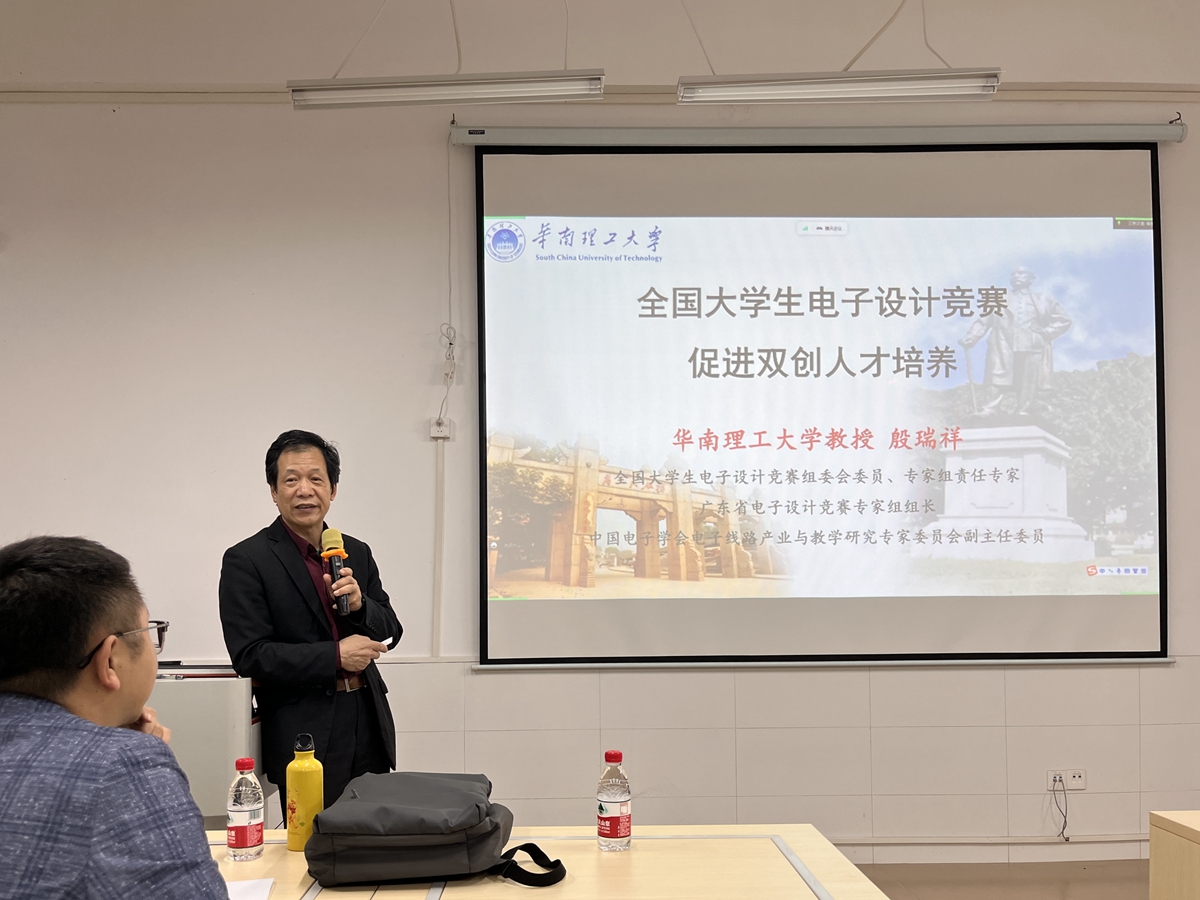 殷瑞祥教授以“全国老员工电子设计竞赛”备赛解析为主要内容,从双创人才培养角度阐述了对科学创新、技术创新、工程创新及创业核心要素的理解,表示“全国老员工电子设计竞赛”能有效锻炼老员工的技术和工程创新能力。随后,殷瑞祥教授结合个人多年评审和指导竞赛经验,为在场师生剖析了比赛组织概况、竞赛目的、赛题要求、竞赛流程等内容,着重讲解了大赛选题的原则和命题趋势,鼓励师生尽早投入比赛状态,做好充足的备赛工作。最后,殷瑞祥教授分享了对赛教融合培养模式的思考,鼓励老师以竞赛内容更新日常实验内容,师生协同发展、相扶共长。报告结束后,殷瑞祥教授与师生进行了互动,现场讨论氛围活跃,师生热情度十分高涨。