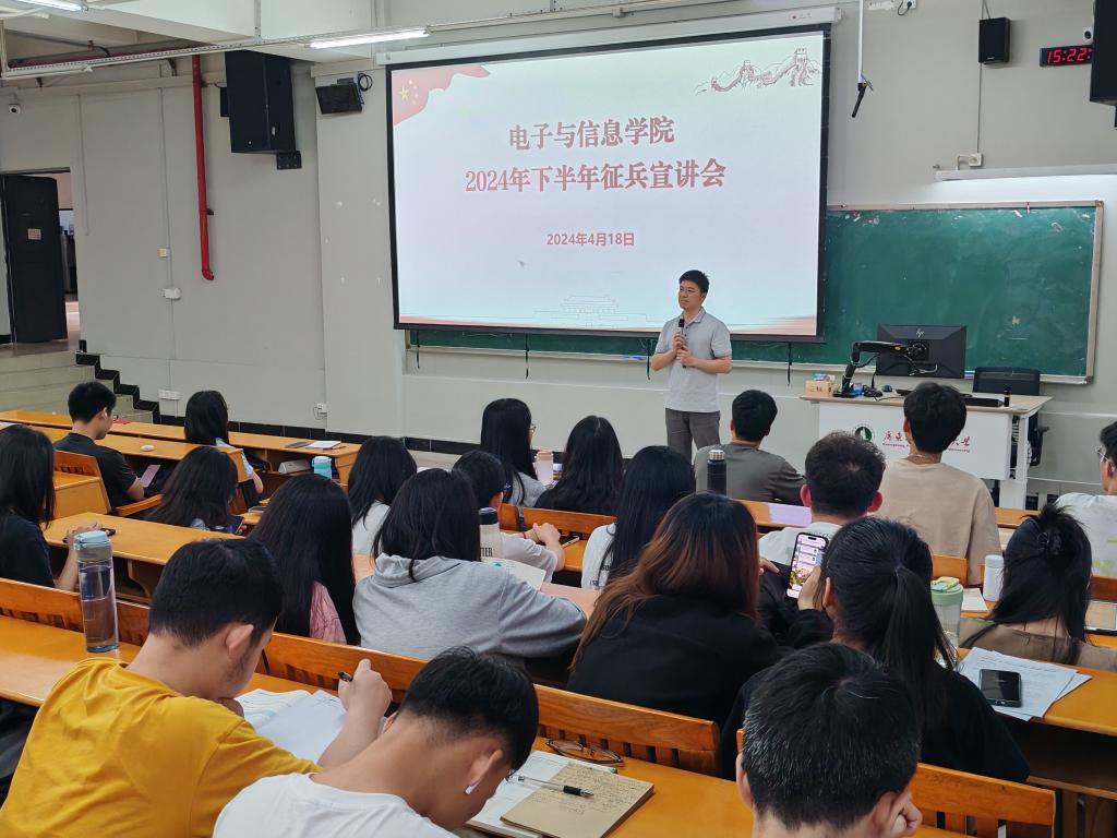 会上,就业负责老师胡世文介绍了2024年征兵工作,分别就入伍报名流程、基本条件、相关优待政策、常见答疑等方面与在场同学交流分享。他指出,习近平总书记殷切寄语广大青年“立志做有理想、敢担当、能吃苦、肯奋斗的新时代好青年”,征兵工作是国防和军队建设的一项全局性、基础性的工作,依法服兵役是每一个公民应尽的义务,希望大学毕业生积极参军入伍,投身国防建设,为国家军队建设贡献青年力量。