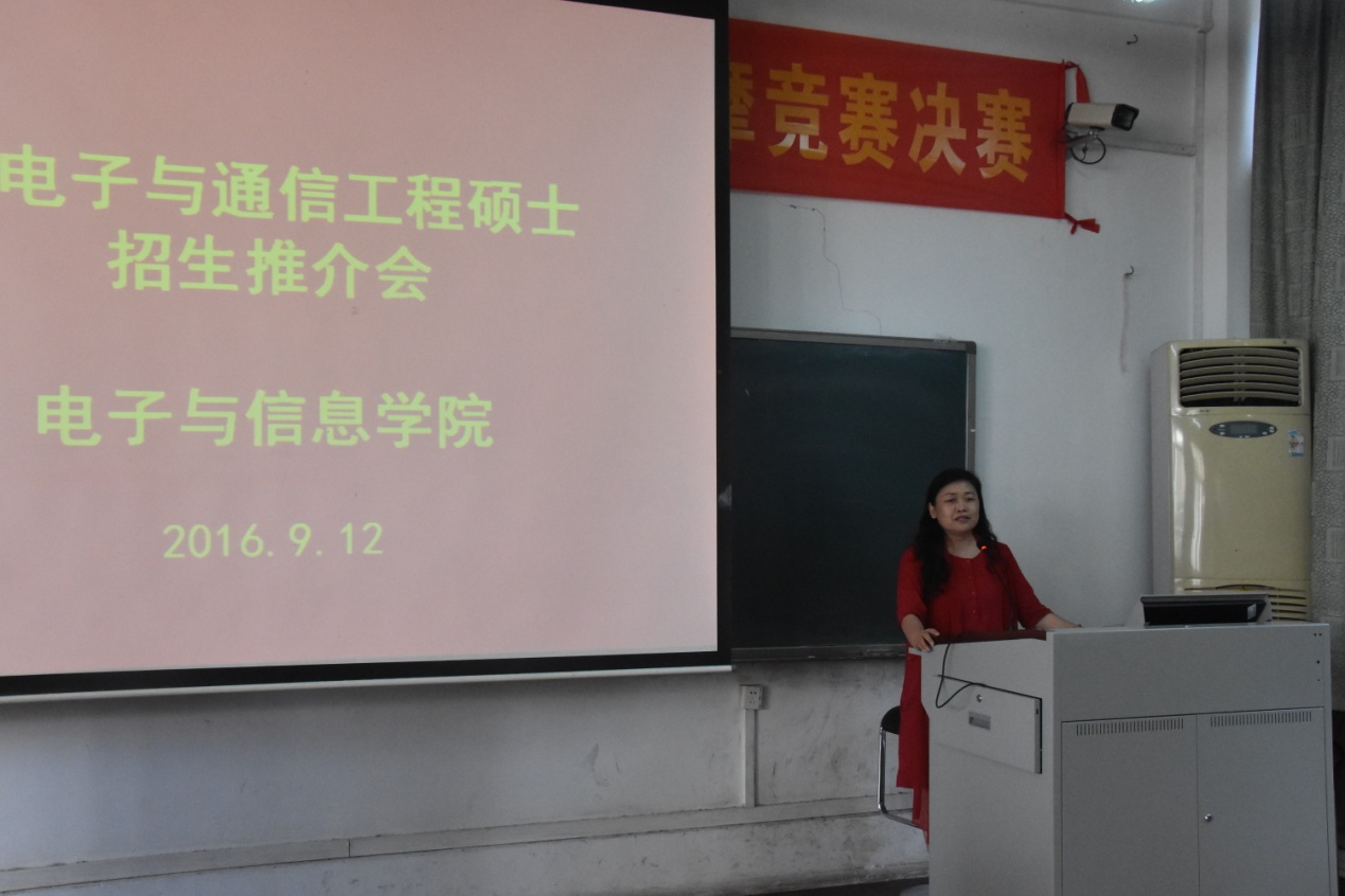 2016年9月12日下午,电子与通信工程硕士招生推介会在第二教学楼204召开。公司副董事长戴青云、研究生处处长崔怀林,电信公司执行经理徐小平、党委副书记罗旭辉、副经理冯明库,硕士生导师代表何影记教授、蔡君博士,辅导员吴琼、李娜娜、韩琼,以及13级、14级、15级同学出席本次会议,为想要考研的同学们介绍硕士点的学科情况、公司的招生优惠政策、本硕士点的研究优势与特色,与同学们分析考研形势、分享考研经验。同学们都积极参加,现场座无虚席。