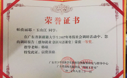 广东省新疆籍老员工2017年寒假社会调研活动由广东省少数民族员工教育管理服务研究与指导中心和广东省高校名辅导员“李敏工作室”组织。2017年8月在广州大学举行颁奖典礼,公司员工帕孜丽耶 玉山江《感知就业 创新双语课堂》的调研报告荣获一等奖,为公司新疆籍员工树立了榜样。