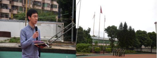 升旗仪式于7:00准时开始,升旗手们着装整齐,踏着矫健的步伐护卫着五星红旗入场,伴随着《义勇军进行曲》的响起,大家集体行注目礼,望着国旗升起,强烈的爱国豪情也在同学们的胸口燃起,激励同学们不断向上的斗志。升旗完毕,辅导员苟雷鸣老师发表讲话。讲话中,苟雷鸣老师通过“一二·九”运动讲述了爱国精神的重要性,并对同学们提出殷切希望。在我国要发展、要富强的时代,同学们要有“我的脚下就是中国,我怎么样中国就怎么样”的责任感,要有民族的自尊心与自信心,把爱国之志变成报国之行,将个人理想与国家的命运连接起来,为祖国未来贡献自己的一份力量。