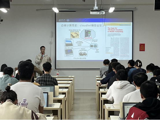 接下来,周教授讲述边缘计算的简史:从cloudiet横空出世,指出该边缘计算成为近数据处理的新模式,并讨论了cloudiet与大家所熟知的云计算的关联。在这过程中,他并未用生硬晦涩的学术名词,而选择了以生动贴切的比喻和讲述自身朋友故事等形式,增进同学们对边缘智能的进一步理解。随后,周教授呈现了模型的结构方式,为同学们讲解边缘计算和人工智能深度融合,如何通过横向协同和纵向融合去解决边缘智能在受限算力的情况下实现低延迟和高精度的问题,以及点明边缘智能是国民经济、现代社会以及国家安全的重要基础设施。让同学们认识到边缘智能的实用性。