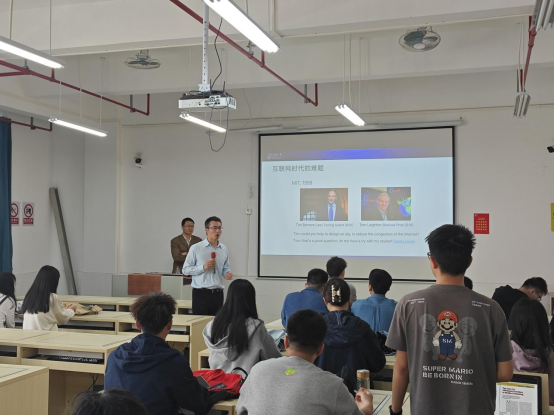 在单纯经理隆重介绍周知教授后,周教授开始了关于边缘智能的精彩讲座。面对同学们难以理解的前沿高端技术,周教授从互联网的迭代进化、云计算、边缘计算道出“边缘智能”主题,并引进实际运用场景、带有趣味性的讲解其运用,幽默地为同学们揭开了边缘智能的神秘面纱。