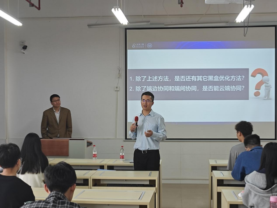 答疑环节:在周教授生动精彩的讲述后,同学们对其认知有了一定的提升。讲座尾声,同学们根据个人的专业学习踊跃提问,其中公司曾健同学提出了“如何将边缘智能与AI进行挂钩?”以及“如何评估边缘智能应用的性能、效率以及质量?”,刘洪铭同学提出“边缘智能在隐私保护和数据安全面临哪些挑战?”、“边缘智能与共享数据库的区别?”,以及其他同学提出的个人疑惑,周教授均针对这些问题进行了详细的解答与指导。